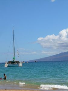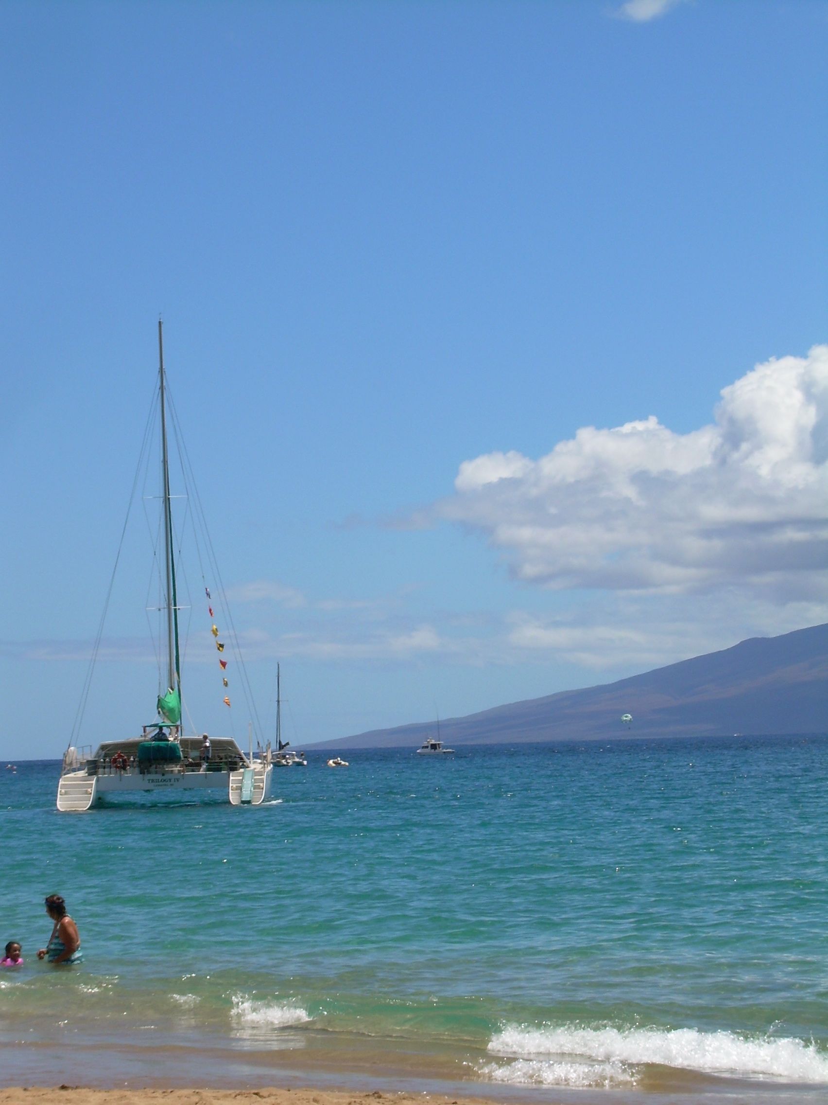 A catamaran, full of sea-voyagers, pulls in to dock on the beach