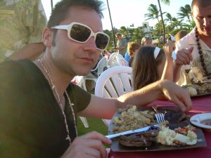 Kalua pig, lomi lomi, macaroni salad, fruit, and teriyaki steak