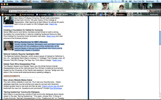 Blushing profusely since yours truly was trying to keep this under the hat, but a dear friend and writer, who earlier this year encouraged applying to residencies and fellowships, insisted on sharing the good news. Who knew the news would spread to Saint Mary’s weekly bulletin?