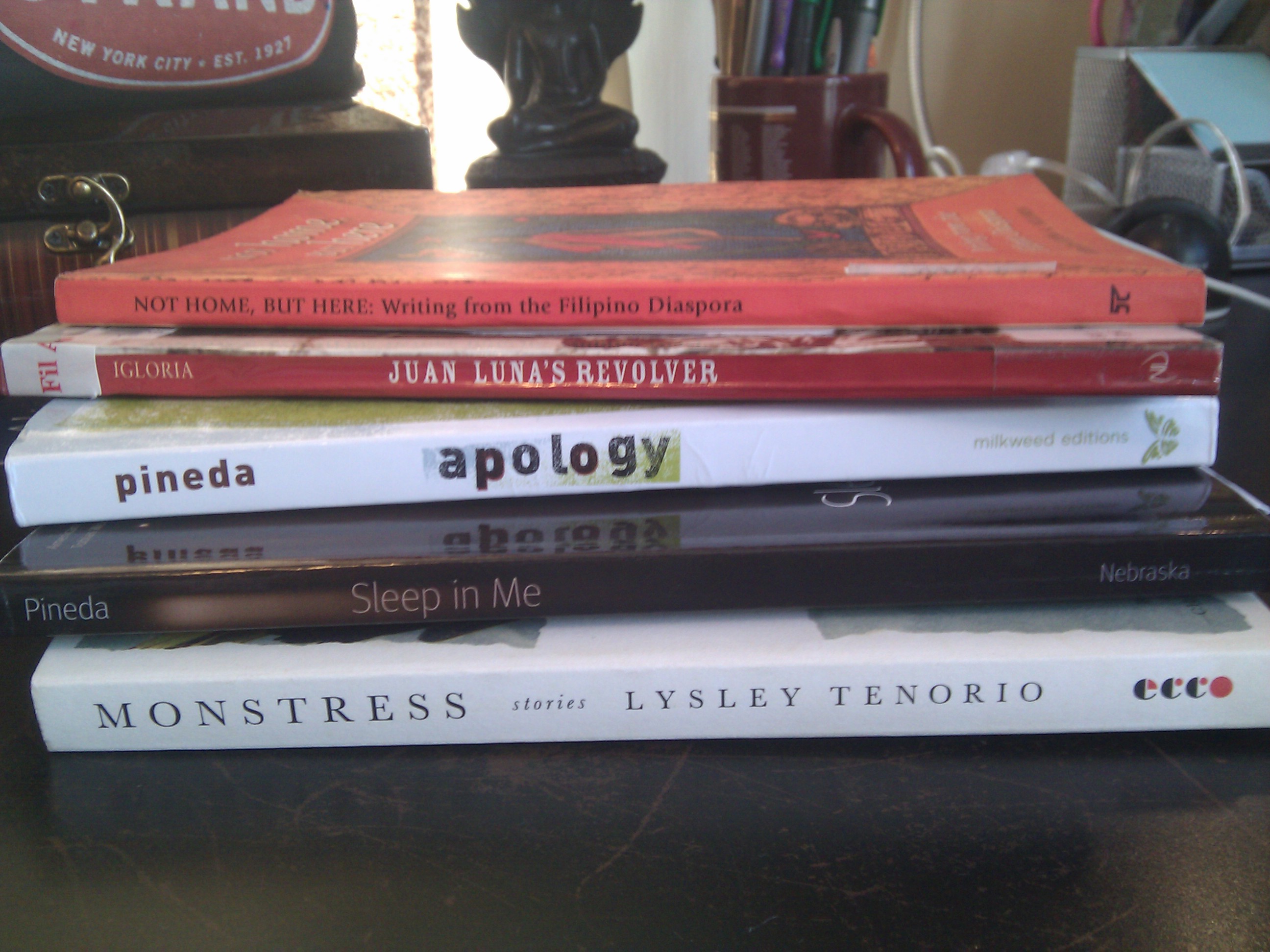 Dipping in and out of the titles Juan Luna’s Revolver, (University of Notre Dame Press, 2009) poetry by Luisa Igloria who also edited the collection of essays in Not Home, But Here: Writing From The Filipino Diaspora (Anvil, 2003), Jon Pineda’s Apology: A Novel (Milkweed National Fiction Prize, 2013), his memoir Sleep In Me (American Lives) and revisiting Lysley Tenorio’s Monstress (Ecco, 2011), some of the questions that have surfaced, which may or may not be put to the panel are as follows:
