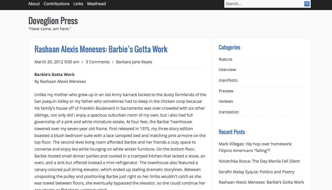 “Barbie’s Gotta Work” (personal essay) published in Doveglion Press, March 2012: