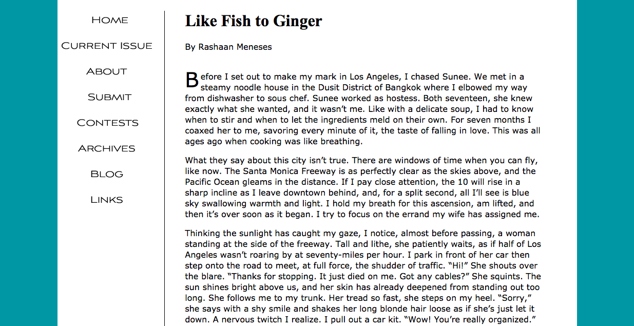 “Like Fish to Ginger”(short fiction) published in UC Riverside’s Coachella Review, Fall 2010: