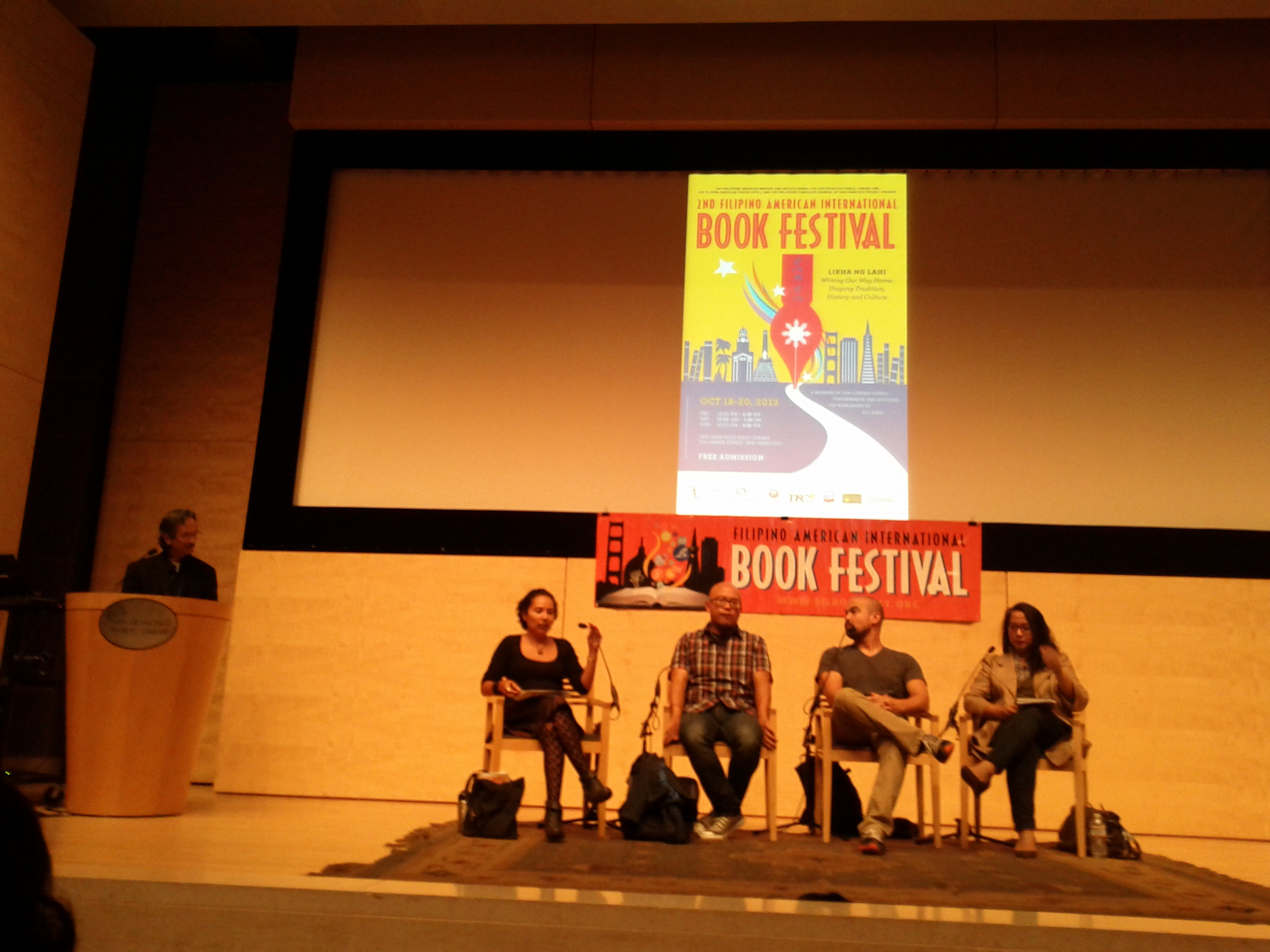 For the space of an hour, in the hushed setting of the Koret Auditorium with a crowd of fifty plus literarastes, I was honored to sit down and talk shop with Luisa Igloria, Jon Pineda, and Lysley Tenorio, moderating the panel “Writing Our Way Home: Shaping Tradition, History and Culture” as part of the Filipino American International Book Festival (Filbookfest 2)- Likhâ ng Lahi. Writing Our Way Home: Shaping Tradition, History and Culture. So how did it all go down?