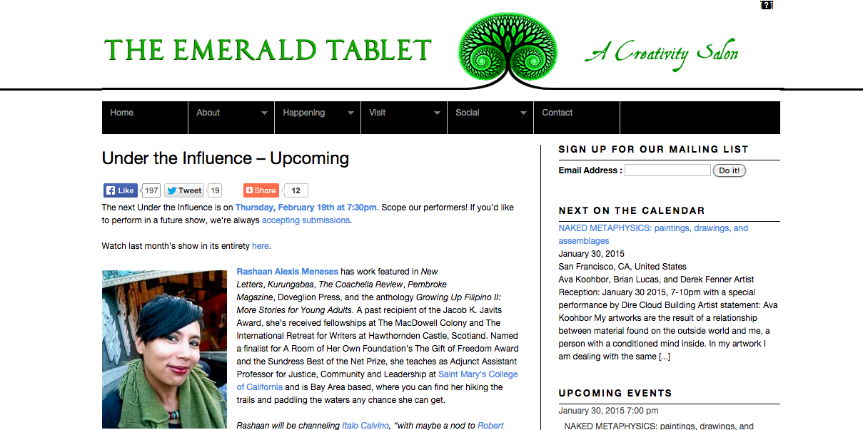 The Emerald Tablet is proud to host the third round of its first homegrown performance series, co-created with and hosted by Quiet Lightning‘s Evan Karp.