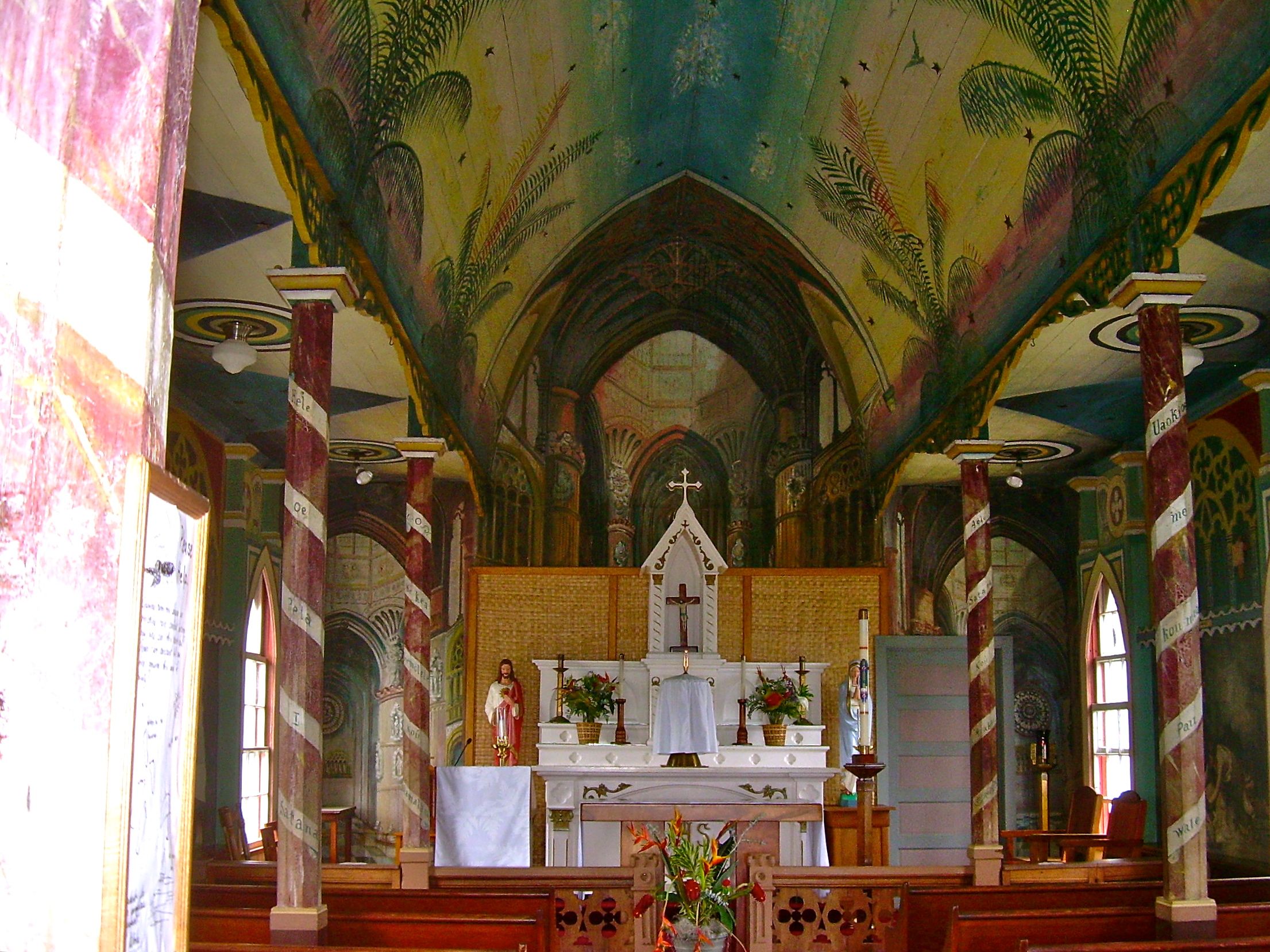 Above Kona-Kailua, on the lush slopes of the mountain is the Kona coffee belt. Here the roads wind through coffee plantations and houses that boast endless mango, papaya, and banana groves. You can see the ocean just below the hillsides, and gape at tropical fruit so bountiful, they’re often left to rot on the street. Up in the thick of jungle, we took a peek at The Painted Church erected in 1899 by Father John Veghle. Saint Benedict’s Catholic Church is filled with Father John’s original art paintings, which helped him to teach his parishioners, many of whom could not read. Most of the Kona Coffee tours are free though Kona Joe’s isn’t. We stopped at Greenwell Farms, one of the historic plantations where the first coffee trees planted are still thriving even after almost hundred years have passed since the owner started their coffee-growing business. Comparing the two places we tasted, Kona Joe’s has Greenwell beat.
